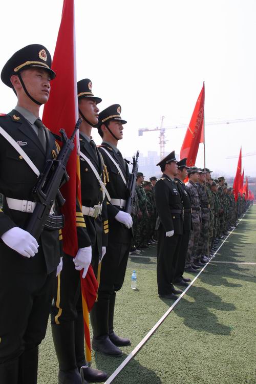 上午10時,點驗大會在嘹亮的軍歌聲中拉開序幕。預備役官兵軍容嚴整,雄姿勃發,精神抖擻,士氣高昂,充分展示了當代預備役軍人的良好精神風貌,展現了部隊良好的軍政素質和優良的戰斗作風。3名儀仗隊員護衛著軍旗,邁著矯健的步伐從主席臺南側走到隊列北側。1500余人的預備役軍人身著整齊的軍裝,按照各自編制,在操場排成整齊的方隊,接受了首長的檢驗并進行了宣誓儀式。點驗結束后,預備役官兵進行了擒敵拳、盾牌警棍術和防爆隊形等三個科目的匯報演示。通過集結點驗,鍛煉提高了團首長機關和營連各級指揮員的組織協調能力,探索研究了組織全團集結點驗的方法路子,錘煉了部隊,強化了作風,有效提高了部隊快速動員和隨時應召的能力。