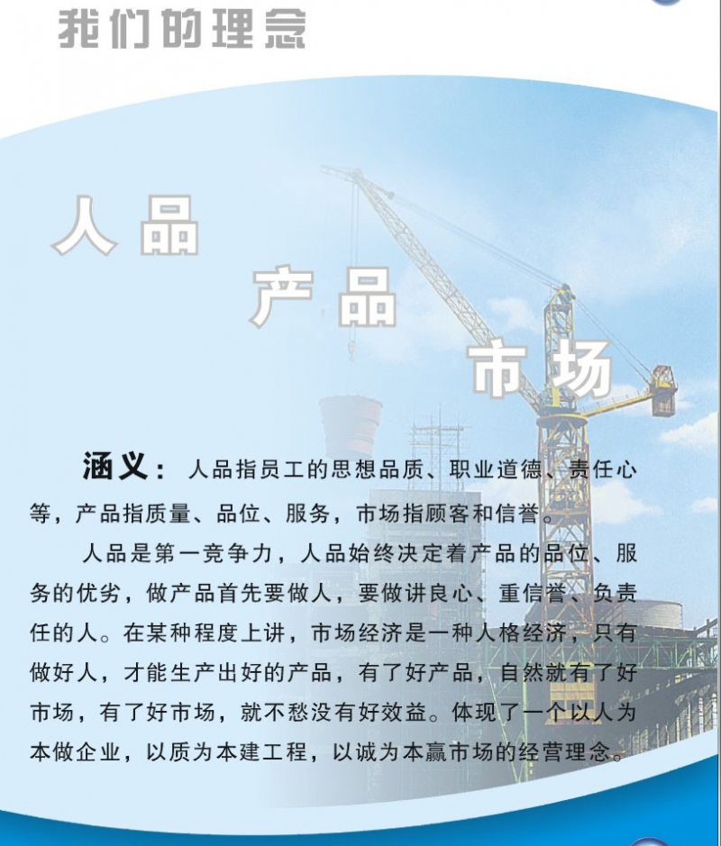 人品是第一競(jìng)爭(zhēng)力,人品始終決定著產(chǎn)品的品位,服務(wù)的優(yōu)劣,做產(chǎn)品首先要做人,要做講良心、重信譽(yù)、負(fù)責(zé)任的人,在某種程度上講,市場(chǎng)經(jīng)濟(jì)是一種人格經(jīng)濟(jì),只有做好人,才能生產(chǎn)出好的產(chǎn)品,有了好產(chǎn)品,自然就有了好市場(chǎng),有了好市場(chǎng),就不愁沒有好效益。體現(xiàn)了一個(gè)以人為本做企業(yè),以質(zhì)為本建工程,以誠(chéng)為本贏市場(chǎng)的經(jīng)營(yíng)理念。